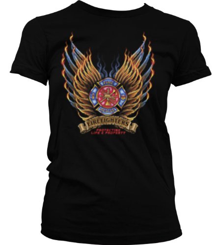 Firefighters, Protecting Life and Property Juniors T-shirt, Flaming Wings Fire Rescue Emblem Juniors Tee, Medium, White Review